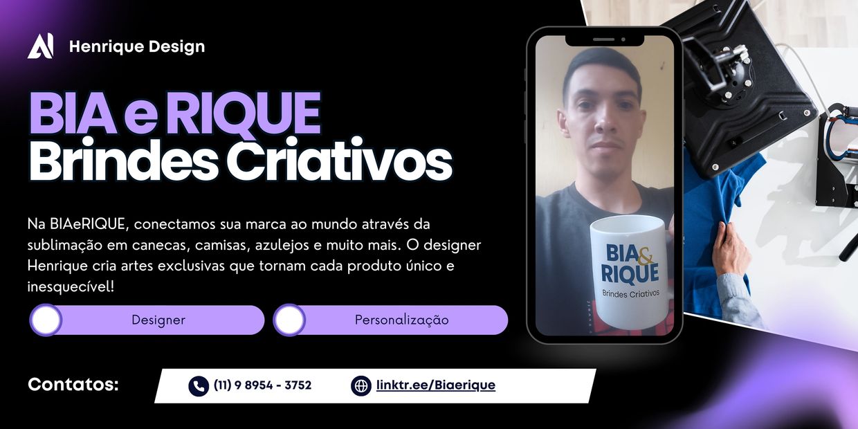 Com foco em design gráfico e sublimação, a Bia & Rique se destaca por proporcionar presentes e lembranças únicas, ideais para datas comemorativas, empresas, eventos e uso pessoal. Mais do que produtos, a empresa entrega experiências personalizadas, refletindo o estilo, a identidade e o sentimento de cada cliente.
